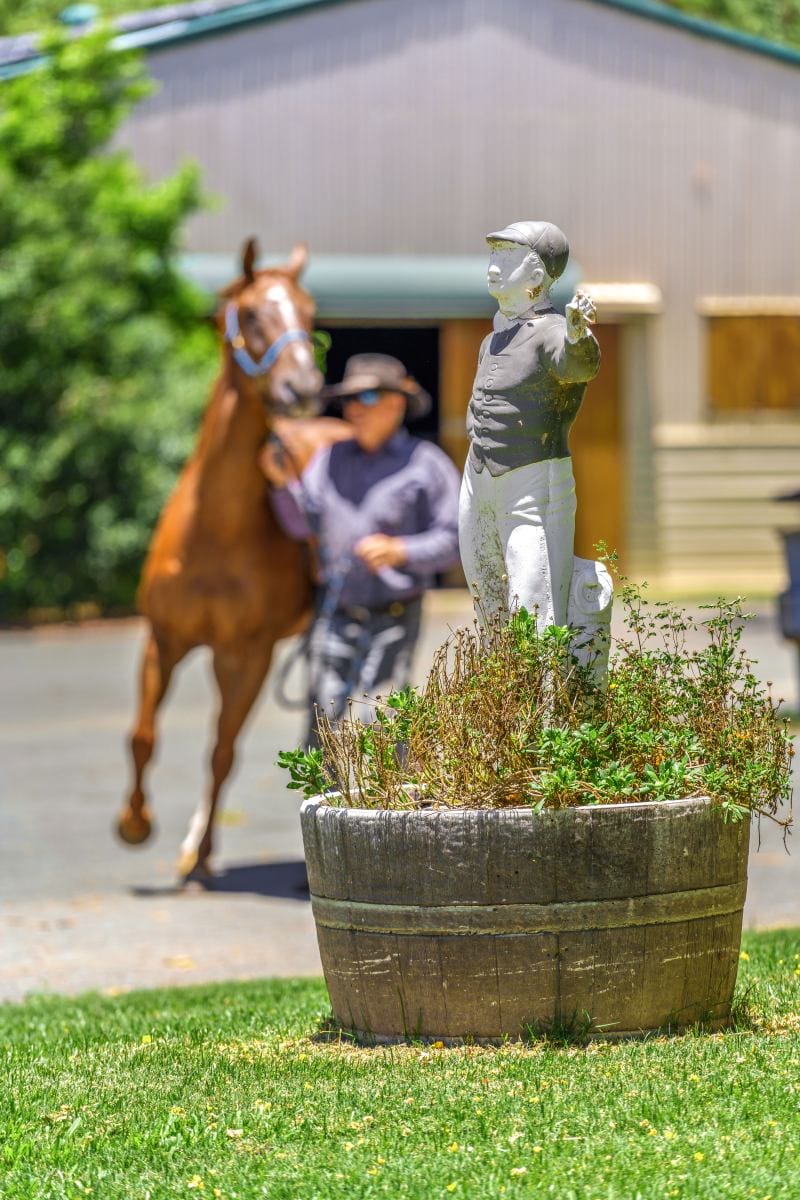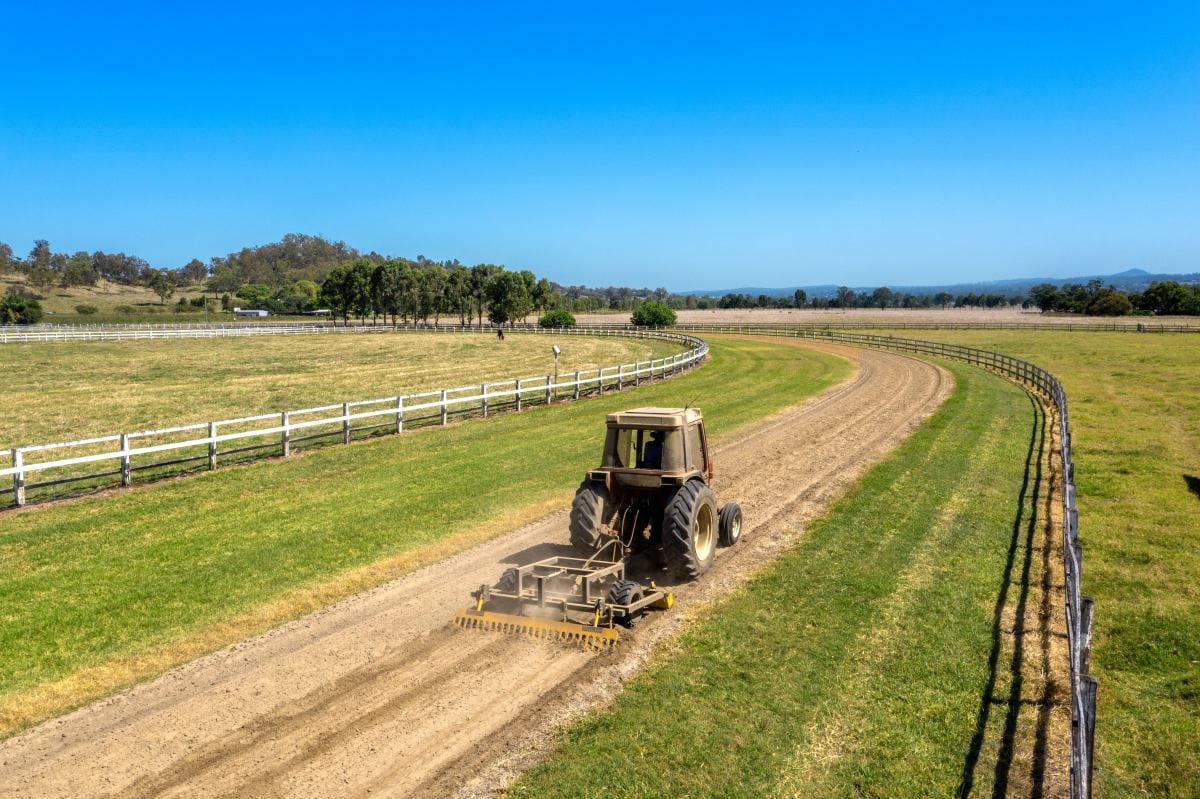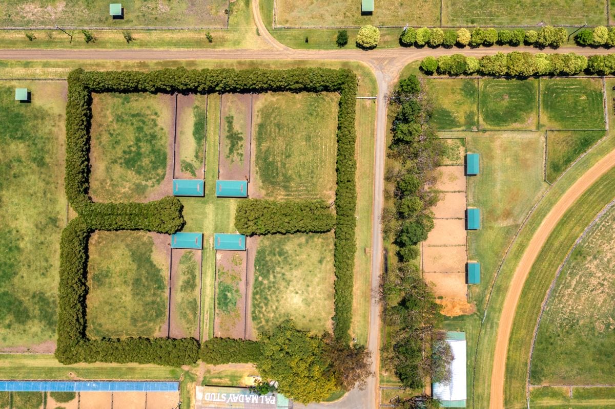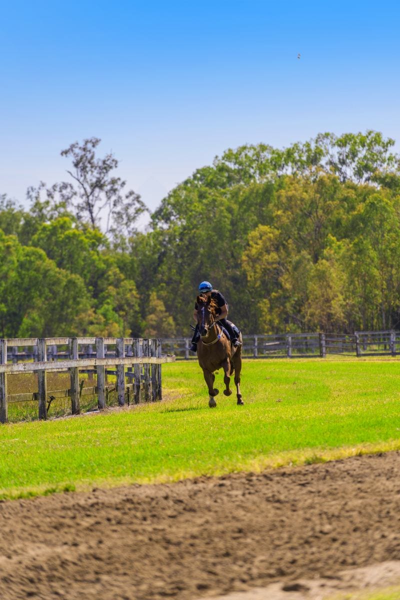 Purpose-built fully cambered training track (1300m sand track, 1200m grass track) + fully fenced internal running rail + 6 internal spelling paddocks